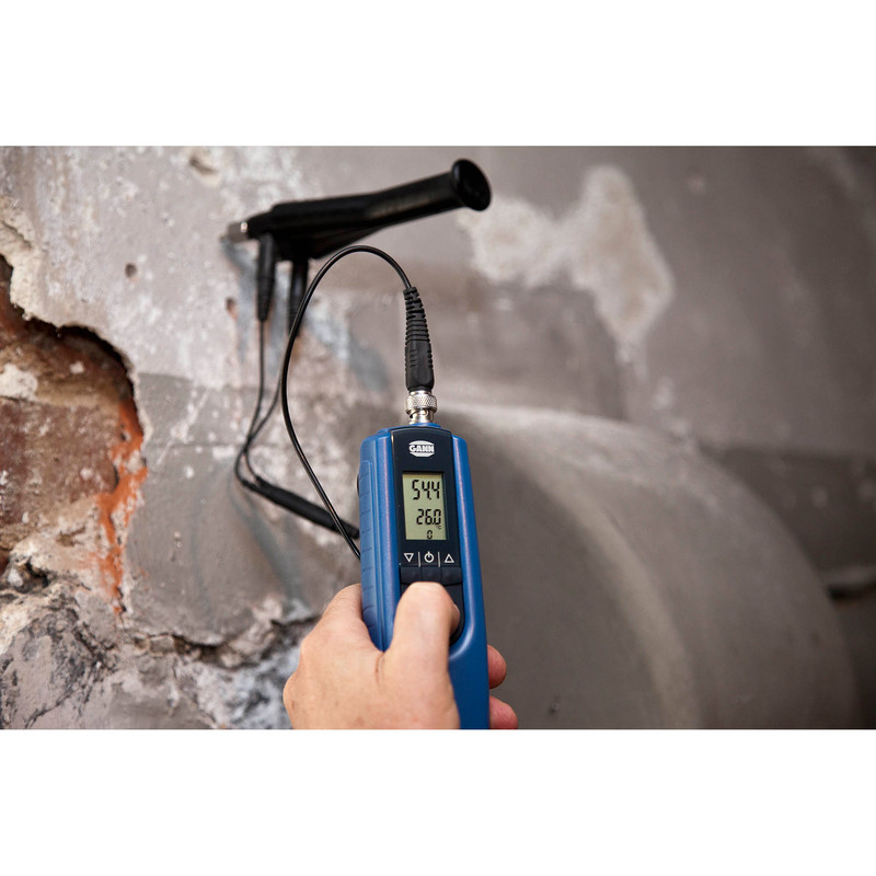 Opis: BL Compact RH-T flex 350 je precizan termalno hidrometar dizajniran za brza mjerenja relativne vlage i temperature zraka. Na principu programirane sorpcije, postoci izotermne težine/mase mogu se odrediti u različitim materijalima (i izolacijskim materijalima) kao i za meko i tvrdo drvo. Zahvaljujući tankoj cijevi senzora prikladan je za široko područje upotrebe, npr: analize, ekspertize, industriju sušenja drveta i strukturalna isušivanja. Može se provjeriti da li su građevinski materijali spremni za završno pokrivne obloge. Zahvaljujući tankoj cijevi senzora (guščji vrat) mejerenja na teško dostupnim mjestima mogu se vršiti brzo i jednostavno. Istovremeno se mogu prikazivati tri različite izmjerene vrijednosti kao npr. kombinacija relativne vlage, temperature zraka i rosišta. Uređaj se isporučuje s baterijom i plastičnom kutijom.